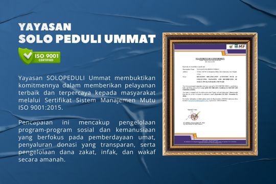 Sebagai bentuk komitmen nyata dalam menjaga kualitas layanan, Yayasan SOLOPEDULI Ummat telah meraih Sertifikasi ISO 9001:2015 pada 7 Oktober 2024. Sertifikat ini diserahkan oleh Ivar Kusradi, D. ST., M.Eng, Kepala Auditor dari Mitra Sejati Fazahara - SIS Certification, kepada Sidik Anshori, S.Sos.I, Ketua Yayasan SOLOPEDULI Ummat. Proses sertifikasi ini melibatkan audit menyeluruh untuk menilai apakah seluruh proses, layanan, dan kegiatan yayasan telah memenuhi persyaratan standar ISO 9001:2015.