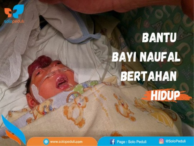 Hanya berbalut kassa dan kain seadanya, bayi Naufal (15 hari) berjuang untuk bertahan hidup tanpa tempurung kepala. Setiap hari penutup kepala diberi kassa steril disemprot cairan infus NaCl agar tidak ada infeksi. Untuk menyeka kepala/otak dibutuhkan air zamzam yang harganya juga tidaklah murah. Suhu tubuh harus terjaga normal. Setiap 4 jam sekali harus cek suhu.