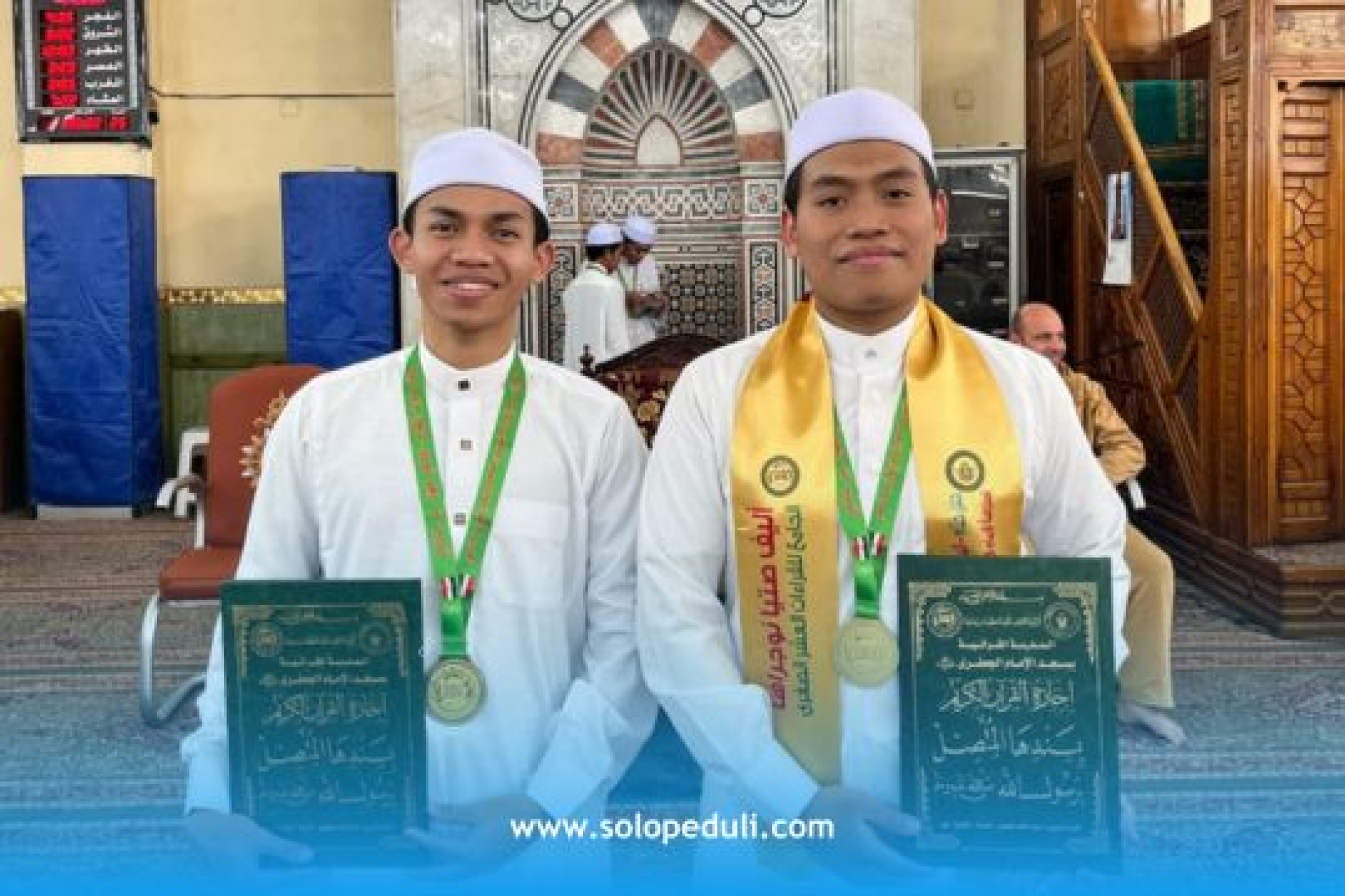 SOLOPEDULI kembali menorehkan kebanggaan melalui program beasiswanya. Dua mahasiswa penerima beasiswa, Taufik Hidayah dan Alif Sotya Nugraha yang kini tengah menempuh pendidikan di Jurusan Syariah Islamiyyah, Universitas Al Azhar, Kairo, Mesir, berhasil menyelesaikan hafalan 30 juz Al-Qur’an.