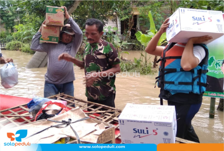 KLATEN - SOLOPEDULI menyalurkan ratusan paket sembako dan membuka Posko bantuan di Klaten. Paket sembako disalurkan untuk warga terdampak banjir di Dusun Guntur Turun Rojo Desa Japanan Cawas Klaten (7/3). Ratusan