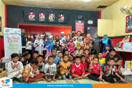 SOLO- Ayam Geprek Abang Ireng bekerja sama dengan Solopeduli berbagi bingkisan dan makan bersama dengan anak yatim dan dhuafa, Minggu (4/3) di outletAyam Geprek Abang Ireng cabang ISI Surakart