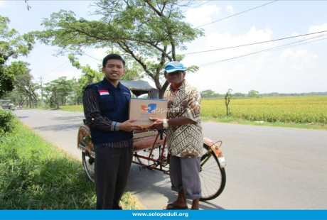 SUKOHARJO-Masih dalam rangka menyemarakkan Milad ke-18, Solopeduli mengadakan kegiatan pembagian sembako kepada 18 orang tukang becak di wil
