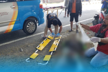 Karanganyar - Ambulan SOLO PEDULI wilayah Sragen segera datang untuk memberikan pertolongan pertama kepada korban kecelakaan lalu lintas yang terjadi di Jalan Raya Solo-Sragen, tepatnya di perempatan Sroyo, Karangan