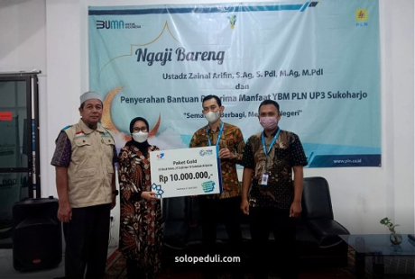 SUKOHARJO, Solo Peduli - Yayasan Baitul Maal (YBM) PT PLN Unit Pelaksana Pelayanan Pelanggan (UP3) Sukoharjo menyelenggarakan program sosial dengan menggandeng Solo Peduli, memberikan santunan anak yatim, membagi takjil dan sedekah Alquran.