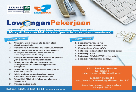 Read moreLowongan Kerja Solo Peduli April 2021 Solo Peduli merupakan Lembaga Resmi Pengelola Dana Zakat, Infaq, Sedekah, dan Wakaf (ZISWAF) skala provinsi no.1 di Indonesia. Kami saat ini sedang membutuhkan tenaga profesional di posisi: