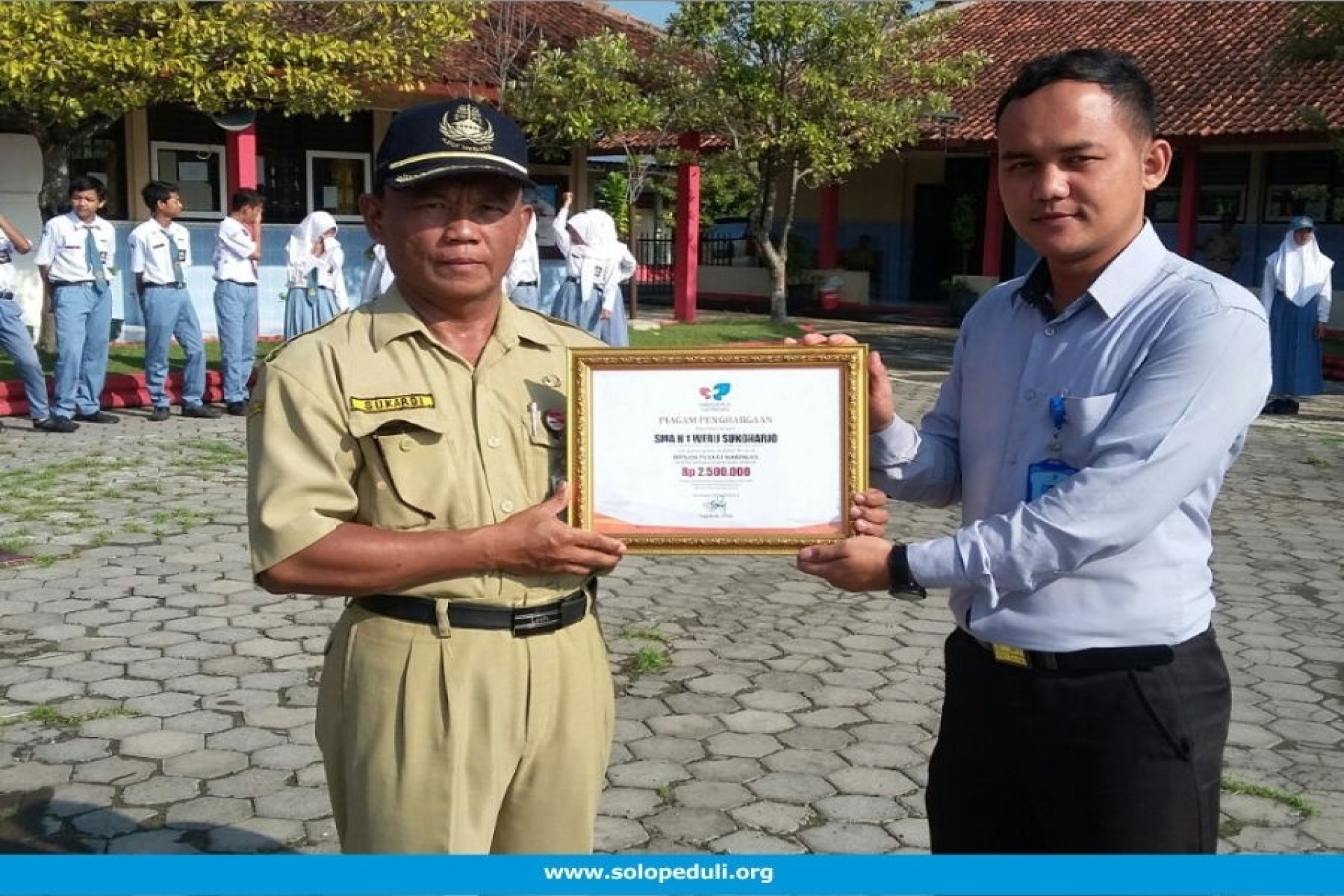 SUKOHARJO-Solopeduli menerima penyaluran donasi peduli Rohingya dari SMA Negeri 1 Weru, Kabupaten Sukoharjo, pada Senin (09/10). Dana yang dikumpulkan oleh keluarga besar SMA Negeri 1 Weru tersebut disalurkan melalui Solopeduli atas inisiasi oleh salah satu Duta Peduli, Bapak Fuad Huda. Penyerahan donasi ke Solopeduli dilaksanakan setelah upacara bendera hari Senin di halaman sekolah.