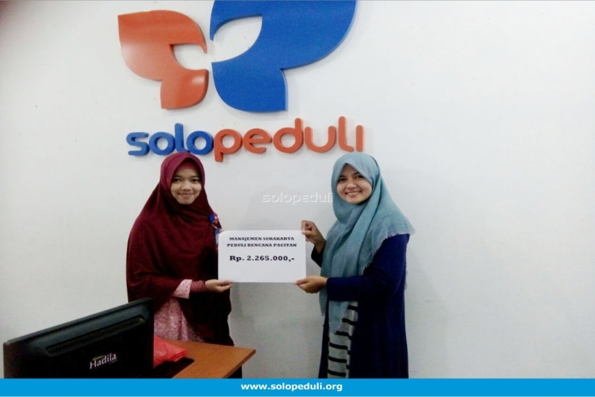 SOLO-Himpunan Mahasiswa Manajemen Surakarta melaksakan aksi penggalangan dana untuk korban banjir dan tanah longsor yang terjadi di beberapa wilayah di Kabupaten Pacitan beberapa waktu lalu. Donasi yang terkumpul kemudian diserahkan kepada Solopeduli di kantor area istimewa (Solopos) pada Sabtu (2/12). Dana di atas dua jutaan itu selanjutnya disalurkan kepada korban bencana banjir dan tanah longsor di Pacitan yang sampai saat ini masih membutuhkan bantuan berupa bahan makanan, pakaian, dan peralatan tidur.