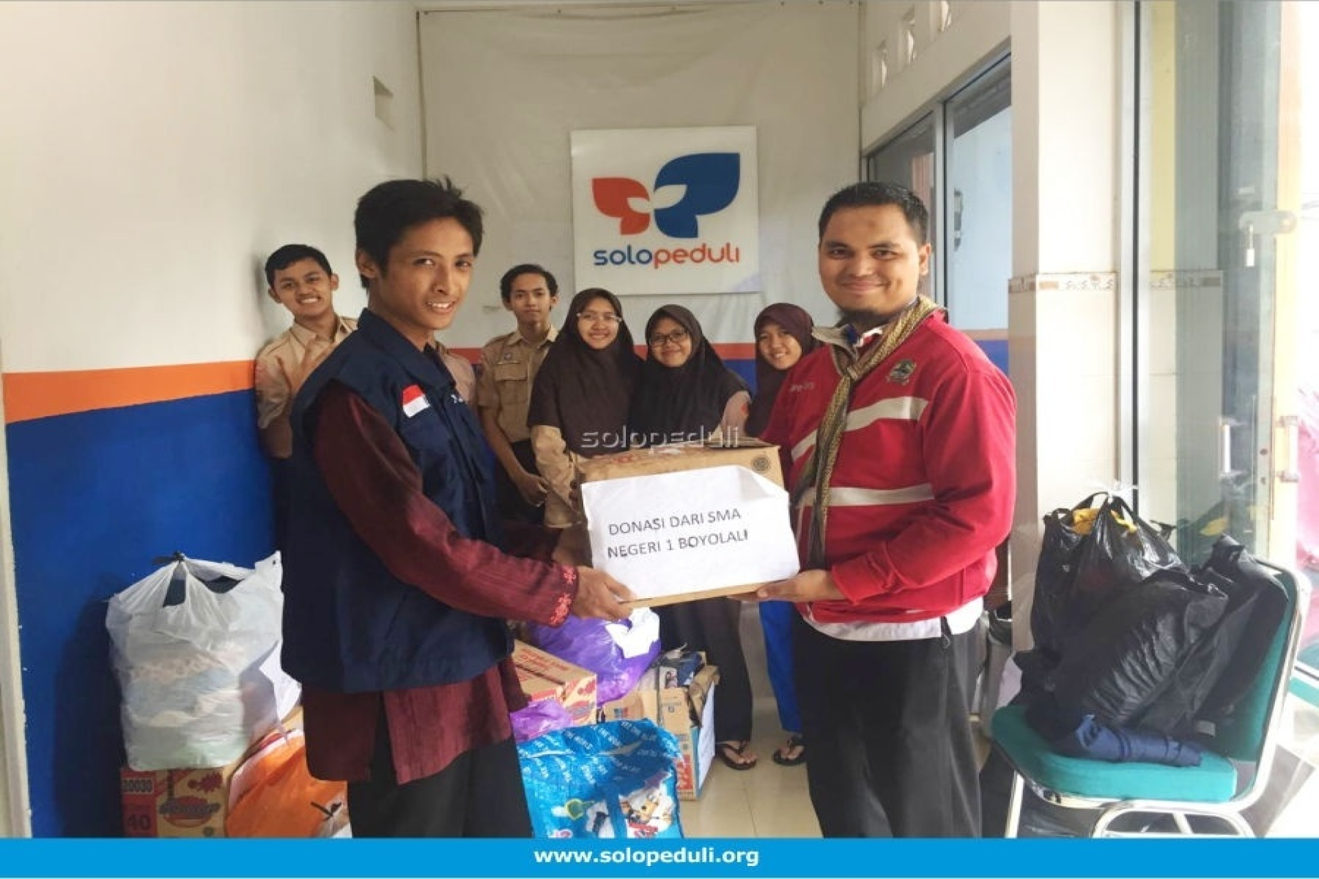 Kegiatan penggalangan dana dikoordinir oleh Palang Merah Remaja (PMR) sekolah setempat. Dana dan beberapa jenis bantuan lain kemudian diserahkan ke Solopeduli untuk selanjutnya disalurkan kepada para korban bencana. Penyerahan donasi dari PMR SMA Negeri 1 Boyolali dilakukan pada Jumat (8/12) yaitu berupa uang sejumlah Rp 1.995.500, makanan, dan baju pantas pakai. Penyerahan bantuan tersebut dilakukan di kantor Solopeduli Area Boyolali. Dari pihak SMA Negeri 1 Boyolali yang menyerahkan adalah ketua PMR, Amarudin Zaidan Yahya, yang didampingi beberapa teman dan salah satu alumni PMR SMA Negeri 1 Boyolali, Bapak Azhari, yang menginisasi kegiatan tersebut. Sementara, dari pihak Solopeduli yang menerima bantuan adalah Kusnanto, Staf Fundraising. [Nad/Kjay]
