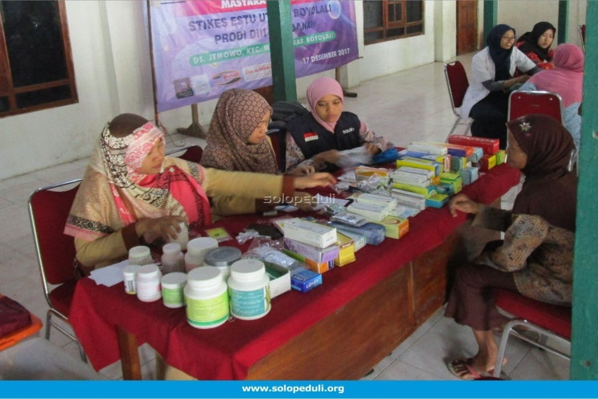 BOYOLALI-STIKES Estu Utomo Boyolali bekerja sama dengan Solopeduli menggelar kegiatan layanan pemeriksaan kesehatan dan pengobatan gratis. Layanan pemeriksaan kesehatan dan pengobatan gratis dilaksanakan pada Senin (18/12) bertempat di Balai Desa Jemowo, Kecamatan Musuk, Kabupaten Boyolali. Secara geografis, lokasi ini berada di kaki Gunung Merapi, masih lumayan terpencil, sekitar 15 km dari Kota Boyolali.