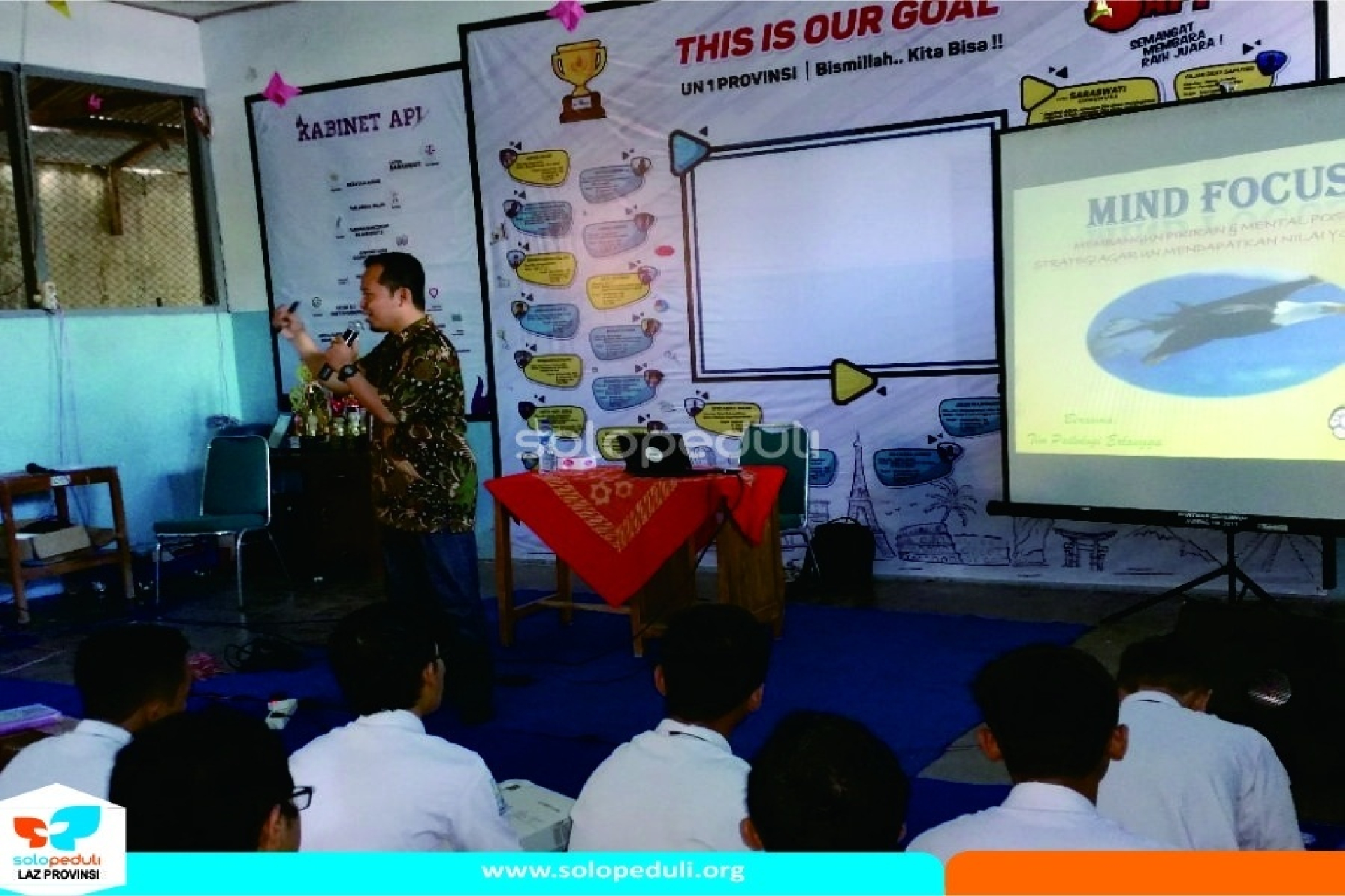 SOLO-Untuk mengawali pembelajaran semester gasal Tahun Ajaran 2017/2018 agar lebih bersemangat, Tim Sukses Ujian Nasional (Timses UN) 1 Provinsi SMK Gratis Solopeduli Surakarta mengadakan Achievement Motivation Training(AMT), Senin (8/1). Acara seminar motivasi ini merupakan agenda khusus untuk siswa kelas XII yang akan segera menghadapi UN pada bulan April nanti. "Ini merupakan motivasi awal tahun bagi para siswa agar mereka kembali bersemangat dalam meraih tujuan setelah libur panjang,"jelas Ustadzah Saraswati, Ketua Timses UN.