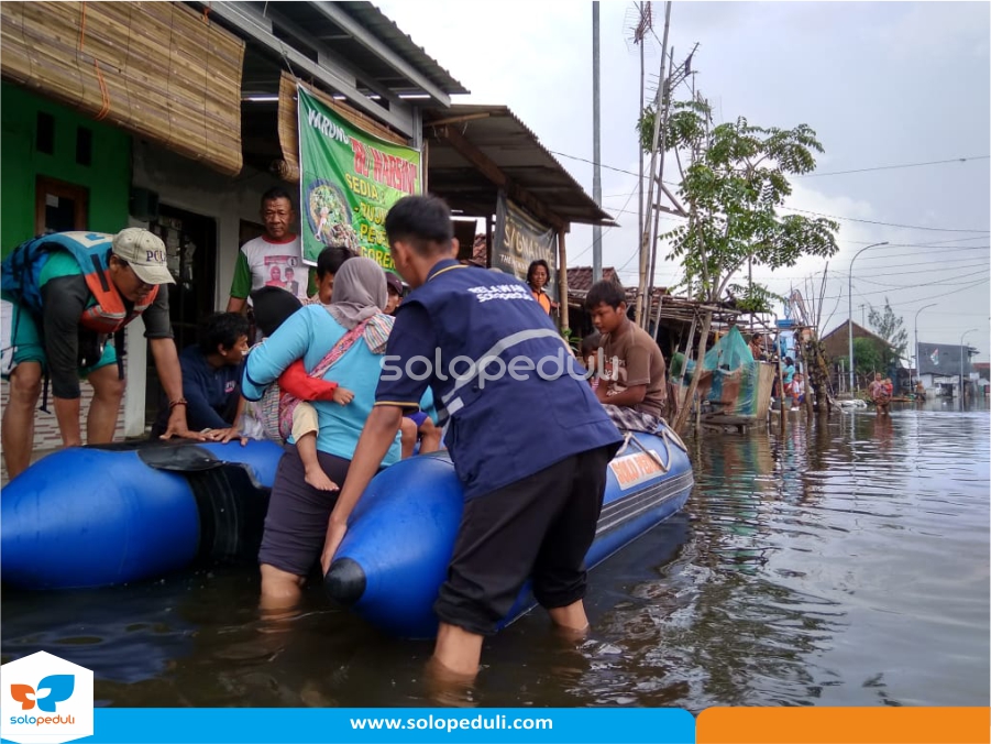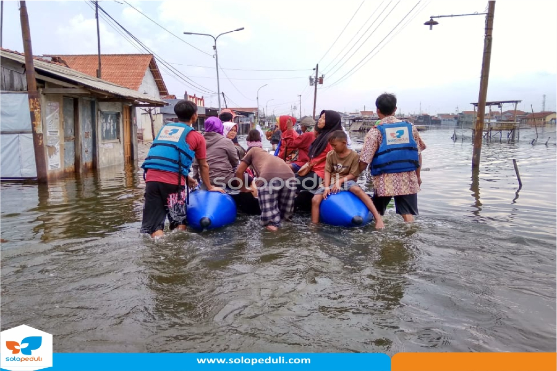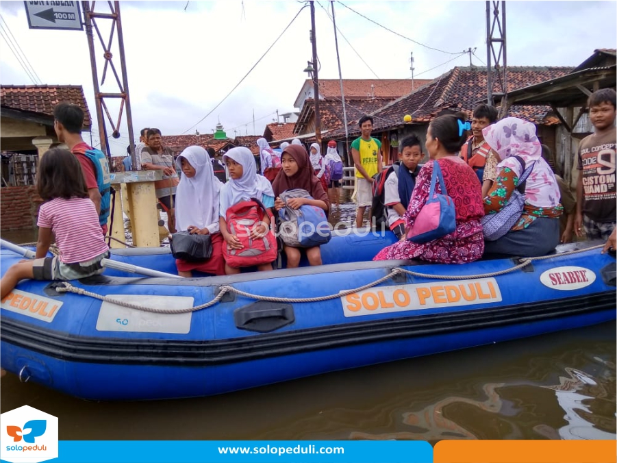 Kordinator SIGAB SOLOPEDULI, Firman menyampaikan Posko utama SOLOPEDULI berada di rumah Bapak Mulyono (Ketua RT) Pabean Jeruk Sari, Tirto, Pekalongan yang terdiri atas 7 RW dan 22 RT. ”Seluruh pemukiman warga digenangi banjir setinggi 60-70 cm (setinggi paha orang dewasa) yang menyebabkan lumpuhnya semua kegiatan warga karena akses jalan tertutup dari segala arah. Pagi ini kami mengantarkan anak-anak berangkat ke sekolah untuk try out dan membantu mengantarkan lansia ke posko-posko pengungsian dengan menggunakan perahu karet / booth. Pagi hingga siang ini kami membagikan makanan siap saji, selimut, terpal dan tikar kepada 600 KK di RW 6 Desa Jeruk Sari. Evakuasi korban banjir sudah kami lakukan semenjak kemarin malam. Tim medis dan bantuan layanan kesehatan juga kami siapkan untuk mengantisipasi bagi yang membutuhkan,” terang Firman kepada tim media SOLOPEDULI
