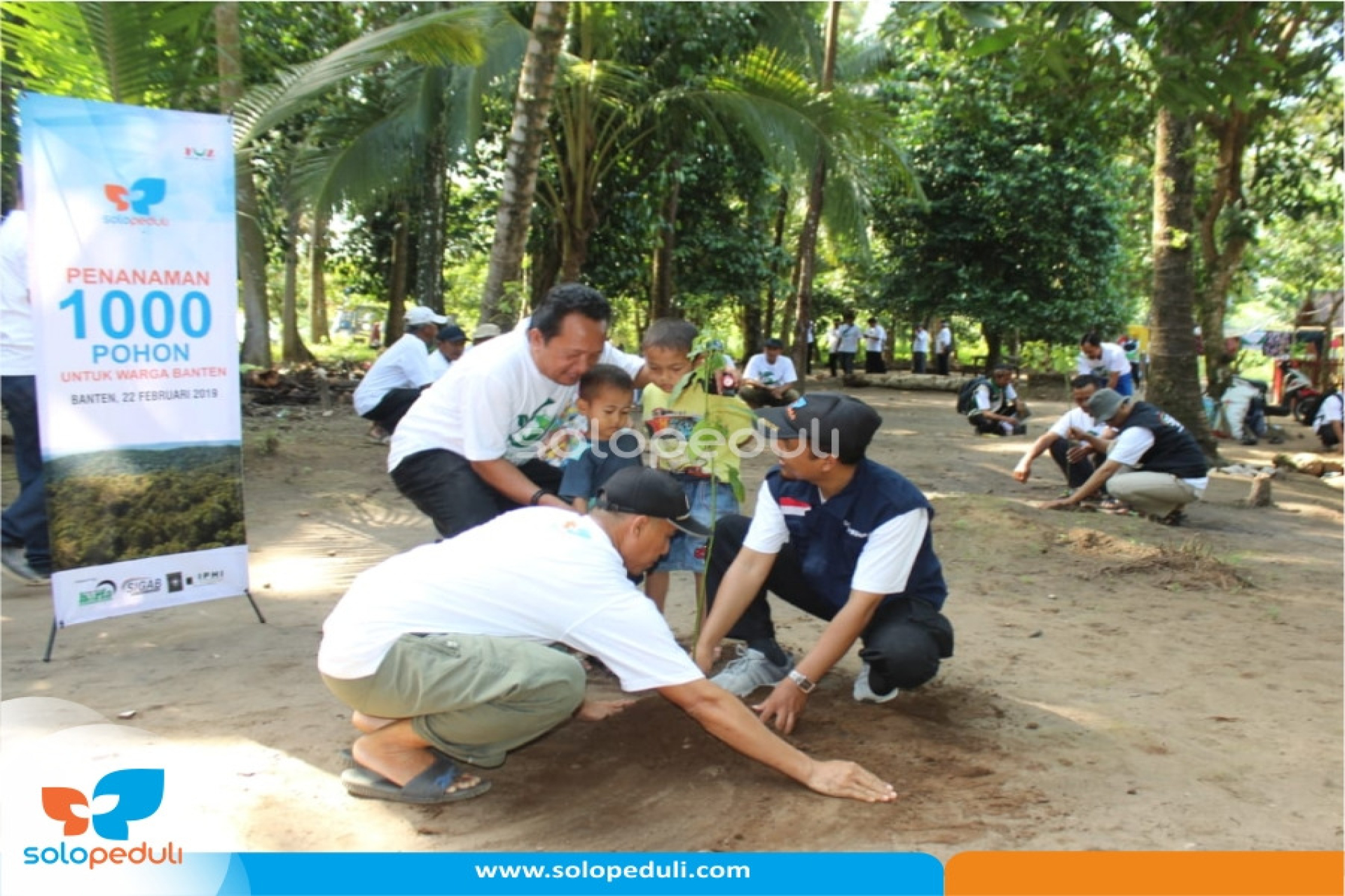 BANTEN - SOLOPEDULI bersama warga terdampak bencana tsunami Selat Sunda menanam 1000 pohon produktif di wilayah terdampak bencana tsunami dan wilayah rentan bencana yakni di Kp Simpang Desa Banyuasih Kecamatan Cigeulis Pandeglang Banten (22/2). Pohon yang ditanam berupa pohon alpukat dan pohon durian. Pemilihan pohon tersebut selain untuk menghijauan, juga untuk menekan dan mencegah banjir dan gempa. Selain itu, penanaman pohon produktif juga untuk menghidupkan perekonomian warga terdampak. Selain menanam pohon, SOLOPEDULI juga membagikan bantuan baju untuk warga.