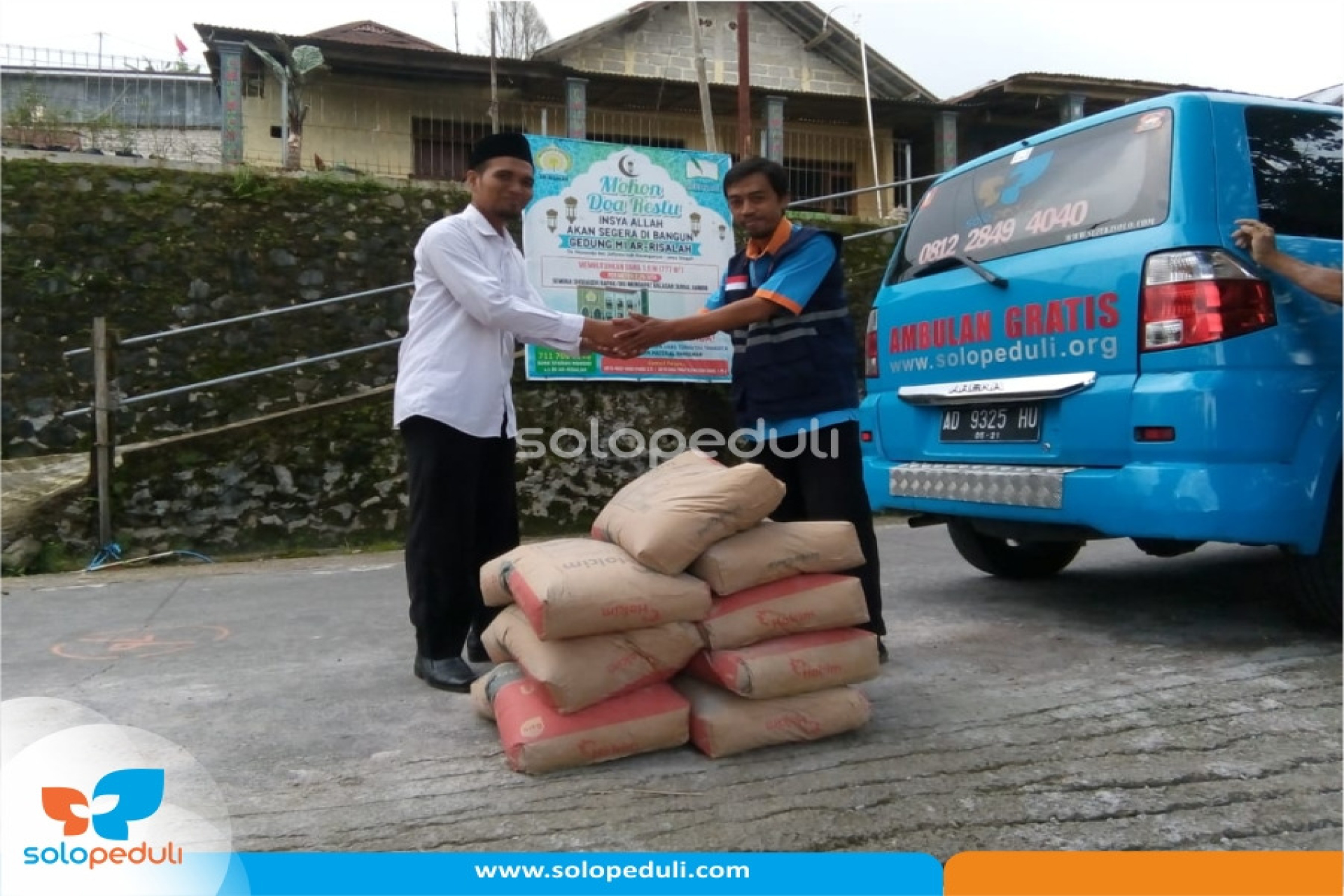 KARANGANYAR - SOLOPEDULI menyalurkan bantuan untuk pembangunan masjid Arrisalah di Desa Beruk Wonorejo Jatiyoso Karanganyar (19/2). Masjid Arrisalah berdiri semenjak 2009 dan sudah meluluskan angkatan ke empat. Hingga saat ini, belum ada gedung sekolah yang memadai untuk kegiatan belajar mengajar siswa Madrasah Ibtidaiyah (MI). Jumlah siswa sekolah tersebut dari kelas 1 sampai kelas 6 ada sejumlah 180 siswa.