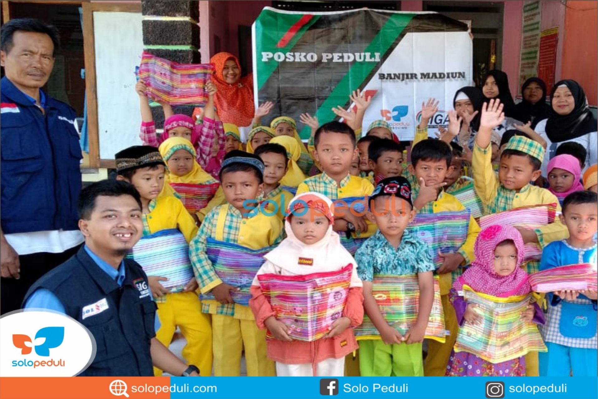MADIUN - Siaga Bencana (SIGAB) SOLOPEDULI menyalurkan bantuan paket sekolah untuk anak-anak korban banjir Madiun pada hari Rabu 20 Maret 2019. Aksi ini dilakukan untuk membantu memenuhi kebutuhan peralatan sekolah dan untuk mensupport dan menyemangati anak-anak paska bencana Banjir.