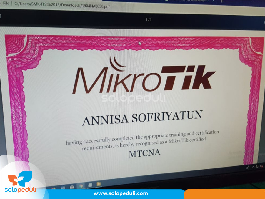 SOLO - Sebanyak 9 orang siswi SMK IT Smart Informatika (SMK ITSI) Surakarta atau SMK Gratis SOLOPEDULI lulus ujian sertifikasi Mikrotik yang diadakan oleh SMK IT SI di Laboratorium Mikrotik pada 23/4. Program ini diadakan untuk menstandarisasi kompetensi siswa serta memberikan kesempatan untuk memperoleh Sertifikat MikroTik yang bertaraf internasional.