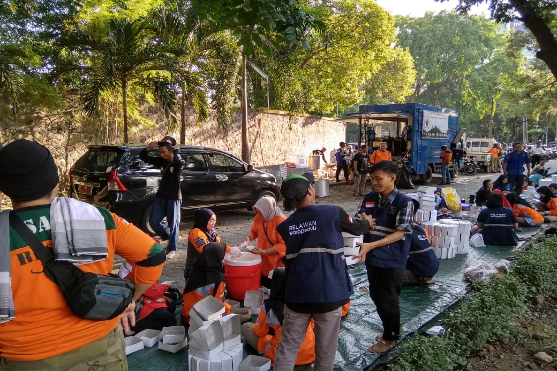 SOLO - Relawan Solo raya memadati area city walk depan stadion Sriwedari Solo pada 25/5. Kehadiran mereka untuk saling mempererat hubungan antar relawan. Dalam kegiatan tesebut para relawan masak bersama dan menyiapkan 1000 takjil bagi para pengendara motor yang melintas dan masyarakat sekitar.