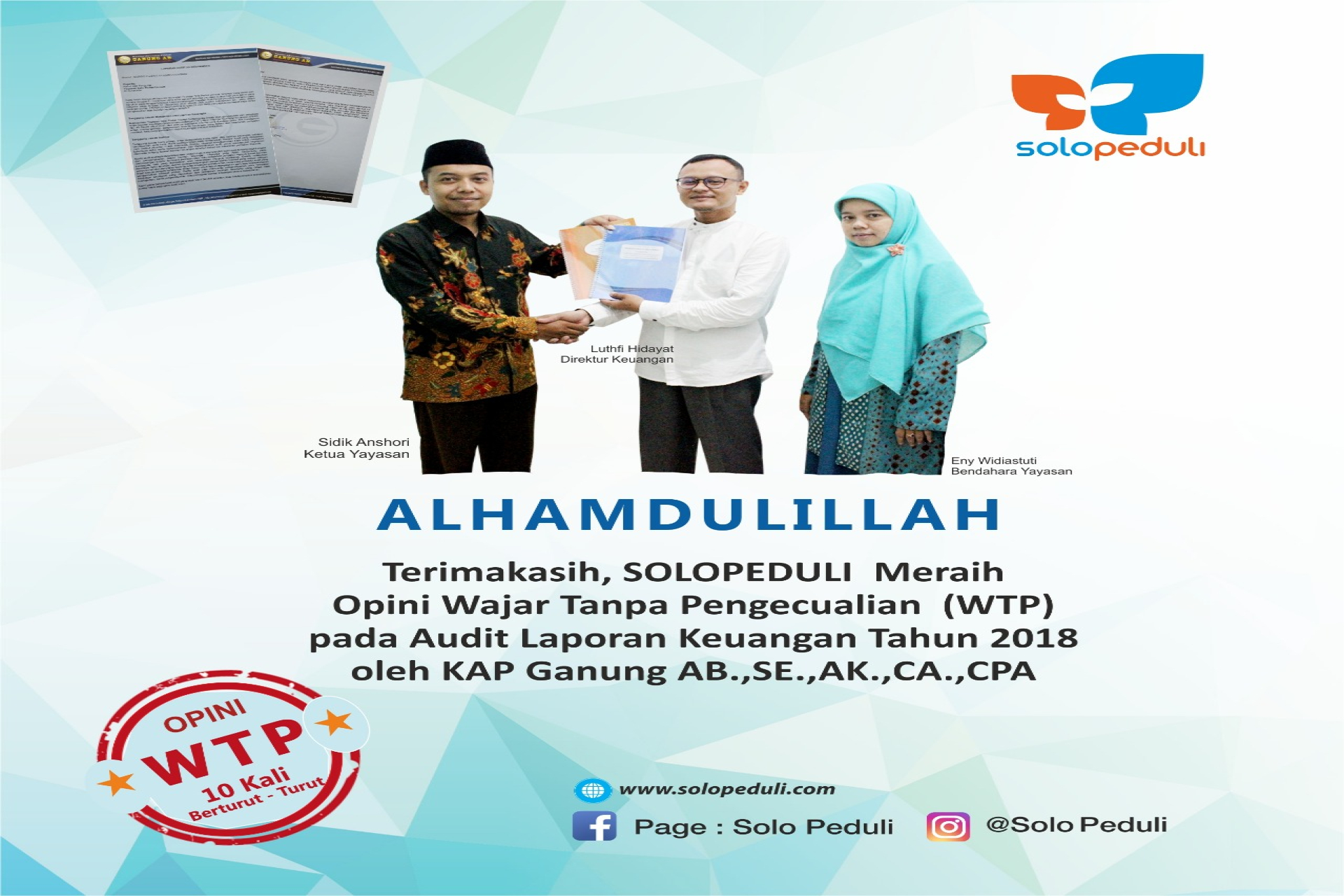 SOLO-Laporan keuangan Lembaga Amil Zakat (LAZ) Solopeduli tahun 2018, meraih opini wajar tanpa pengecualian (WTP) dari kantor Akuntan Publik Ganung AB. Dengan demikian, tahun ini untuk ke-10 kalinya LAZ Solopeduli meraih opini WTP secara berturut-turut sejak 2009.