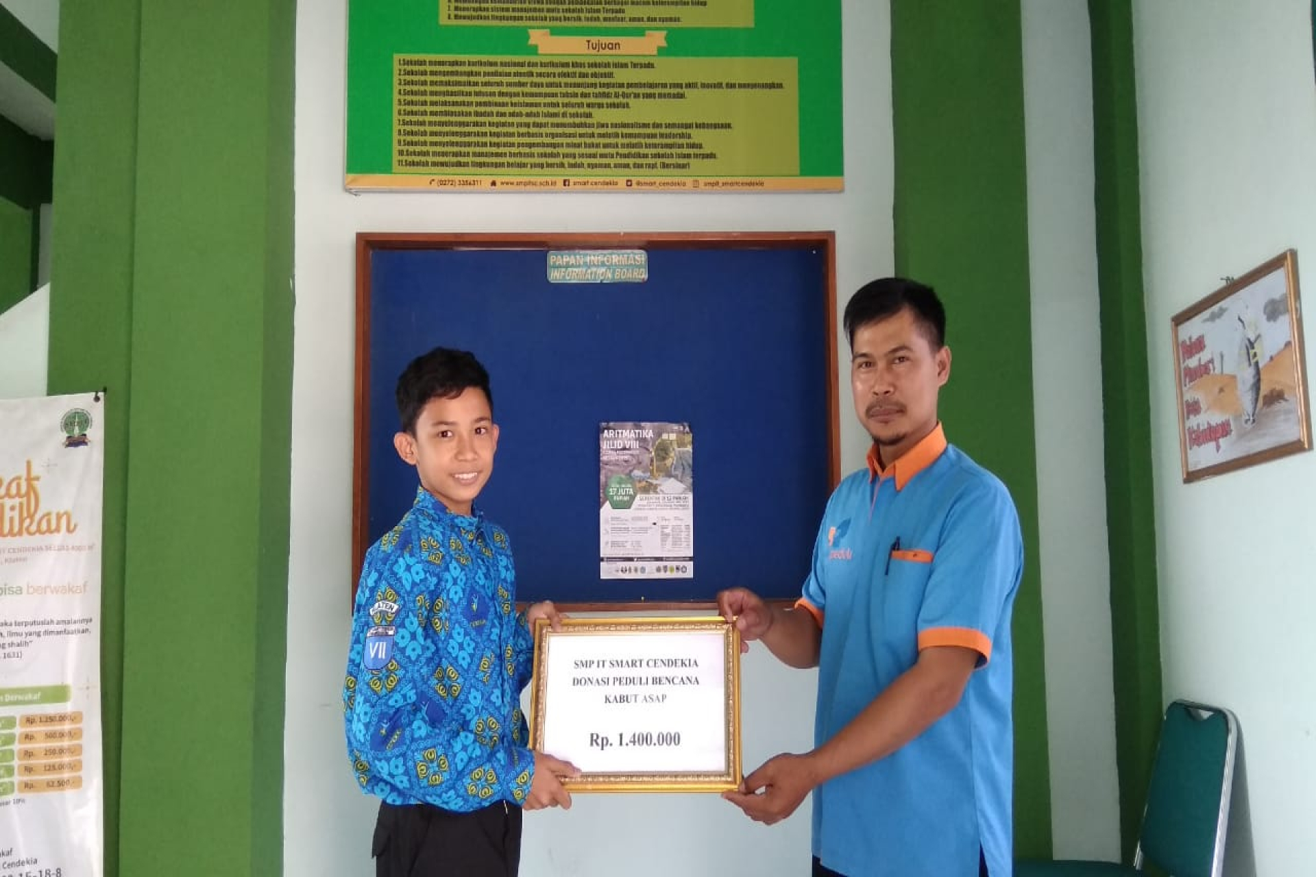 KLATEN - Seluruh siswa, guru, staff, dan karyawan SMPIT Smart Cendekia Karanganom Klaten menggalang dana untuk korban dampak asap di Riau. Hasil penggalangan dana sebesar Rp 1.400.000,- disalurkan melalui SOLOPEDULI. Hasil penggalangan dana diserahkan oleh perwakilan SMPIT Smart Cendekia, Rafa Athala kepada perwakilan SOLOPEDULI Klaten, Suprapto pada 26/9.
