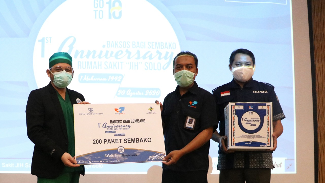 Penyerah paket sembako secara simbolisasi dilakukan langsung oleh Direktur Utama Rumah Sakit JIH Solo, dr Didit Novianto, Sp.PD FINASIM kepada Direktur Utama SOLOPEDULI, Sidik Anshori. S.Sos.I di Rumah Sakit JIH Solo di Jl. Adi Sucipto No.118, Jajar, Kecamatan Laweyan, Kota Surakarta, Jawa Tengah pada 12/8. Kegiatan ini merupakan rangkaian kegiatan anniversary pertama Rumah Sakit JIH Solo yang jatuh pada tanggal 20 Agustus.