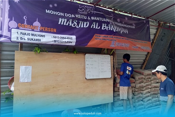 SOLOPEDULI menyalurkan bantuan program Benah Rumah Ibadah. Bedah rumah Ibadah kali ini dilakukan pada Masjid Al Barokah di Dk Gondanglegi, RW 06, Ds Gondangsari, Kecamatan Juwiring, Kabupaten Klaten. Bantuan berupa semen ini diserahkan secara langsung oleh tim pendayagunaan SOLOPEDULI, Yudha Baskara kepada Ketua Panitia Pembangunan, Parjono Mulyono pada 27/10.