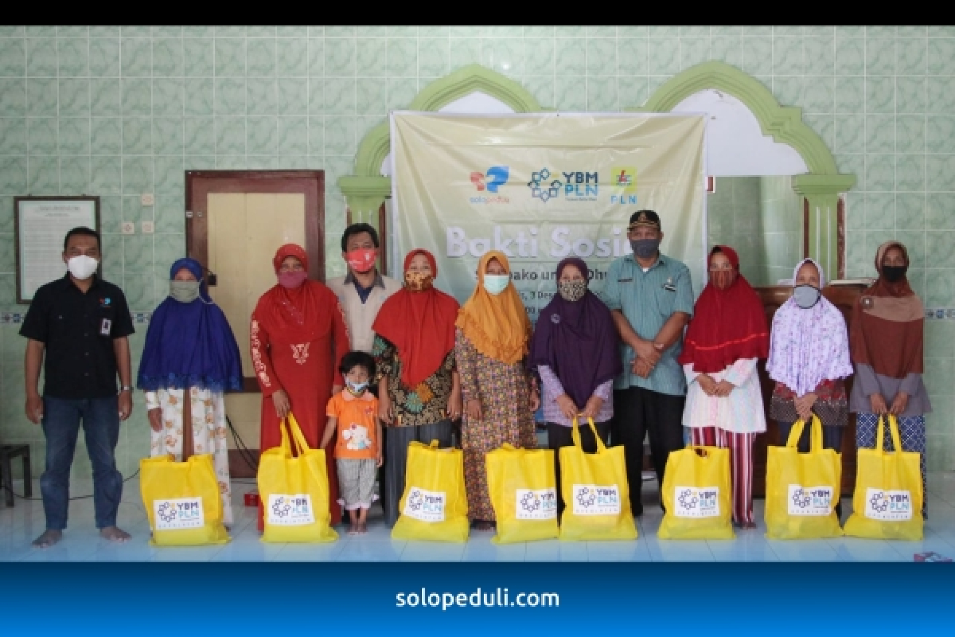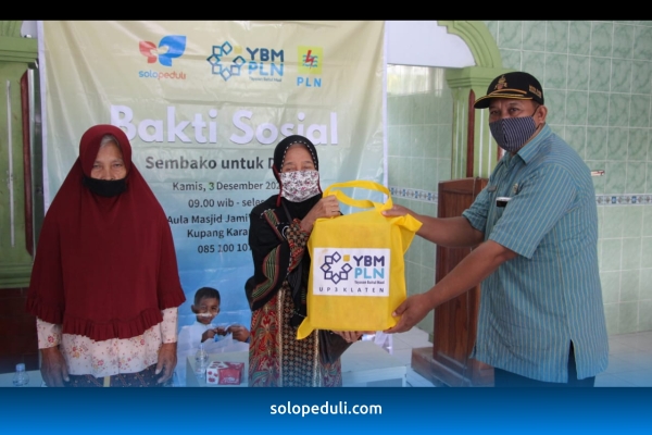 Melihat kondisi yang terjadi, Yayasan Baitul Maal (YBM) PLN Unit Pelaksana Pelayanan Pelanggan (UP3) Klaten mengandeng SOLOPEDULI menggelar bakti Sosial (Baksos) berupa pemberian sembako untuk warga dhuafa yang terdampak covid. Sembako yang berisi beras, minyak, mie, gula, teh, kecap, susu, biskuit, dan wafer ini disalurkan di Aula Masjid Jami' Abu Nashir, Desa Kupang, Kecamatan Karangdowo, Klaten pada 3/12.