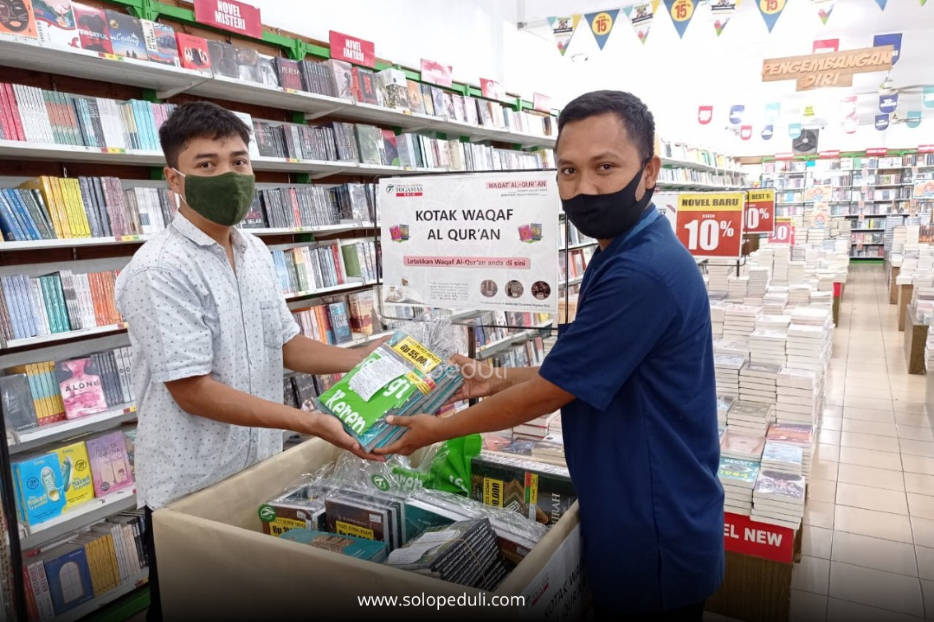 SURAKARTA, SOLOPEDULI – Untuk meningkatkan gerakan wafaf, Togamas Solo menggerakan progam Wakaf Al Quran. Program Wakaf Al Quran dengan system pembelian Al Quran di Togamas dengan Akad di Wakafkan. Al Quran tersebut di tinggal di Togamas dan kemudian di teruskan kepada SOLOPEDULI yang nantinya akan di peruntukan untuk Sekolah, pesantren, masjid, dan warga terdampak bencana di seluruh pelosok negeri.