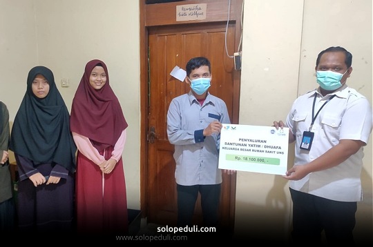 Santunan sebesar Rp 18.100.000,- diserahkan langsung oleh Pengurus Sentra Kegiatan Islam RS UNS, Dr. Bima kepada Kepala Asrama Insan Cendekia Solo Peduli, Ustaz Afif bersama perwakilan dari santri putri, Senin (25/04).