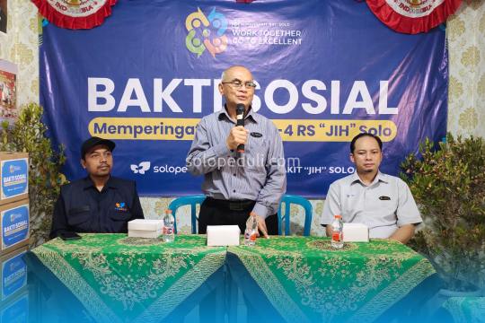 Sambutan dari RS JIH Solo dalam acara bakti sosial kali ini langsung disampaikan oleh Drs. Nono Sukrono M.M selaku Direktur PT Yabinstra Medika Farma. Beliau menyampaikan, "Memperingati Milad ke-4 RS JIH Solo kami mengharapkan keridhoan Allah dan berdoa semoga RS JIH semakin berkembang dan maju untuk kedepannya. Mudah-mudahan bakti sosial ini bermanfaat untuk kita semua. Kami mengucapkan terima kasih dengan doa-doa yang diberikan dan dipanjatkan untuk RS JIH Solo, semoga kami terus bisa memberikan kebermanfaatan. Terima kasih kepada Solo Peduli yang kali ke-4 ini kita bisa berkolaborasi. Bersama Solo Peduli kami dapat dengan mudah untuk menyalurkan bantuan sembako ini karena SOLO PEDULI yang lebih tahu mana daerah yang membutuhkan." tutur Drs. Nono Sukrono, M.M.