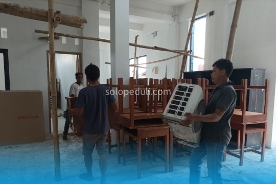 Gotong royong Ustadz/ustadzah SMK dan beberapa karyawan SOLO PEDULI untuk pindahan, terbagi menjadi dua tim. Tim pertama bertugas menata barang-barang SMK lama seperti kursi, meja, dan buku untuk diangkut menggunakan mobil pick up, sedangkan tim kedua melakukan persiapan dan pembersihan untuk menyusun barang-barang yang telah dipindahkan ke SMK baru.