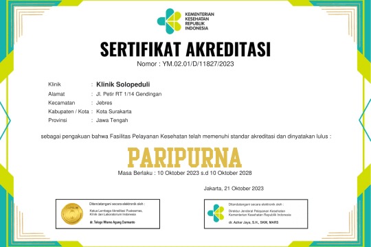 Akreditasi berlaku 10 Oktober 2023 sampai dengan 10 Oktober 2028. Hasil akreditasi ini membuktikan bahwa Klinik Rawat Inap SOLOPEDULI memiliki sistem manajemen bermutu dan pelayanan yang mumpuni dalam melayani masyarakat, memiliki komitmen untuk terus mengedepankan mutu pelayanan dan tata kelola klinik guna lebih tertib, teratur, dan profesional.