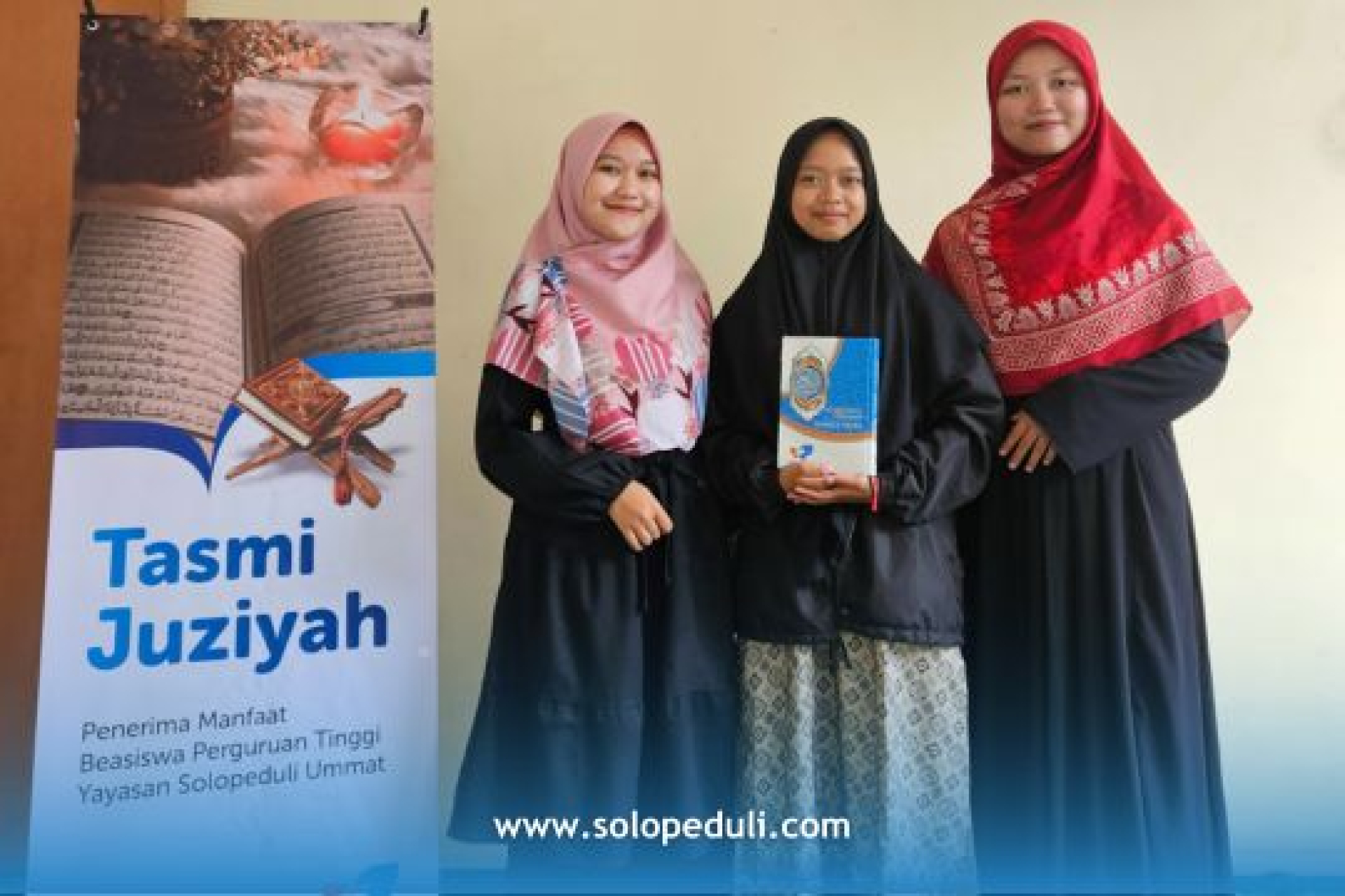 Beasiswa SOLOPEDULI - Sebagai bagian dari kewajiban Himpunan Mahasiswa Peduli (HMP) SOLOPEDULI, tiga mahasiswi sukses melaksanakan ujian tasmik (Hafalan Al-Quran) Juziyah dalam satu kali duduk. Kegiatan ini berlangsung di Masjid Asalam Bolon, Colomadu, Karanganyar, pada Sabtu pagi, (08/02/2025)