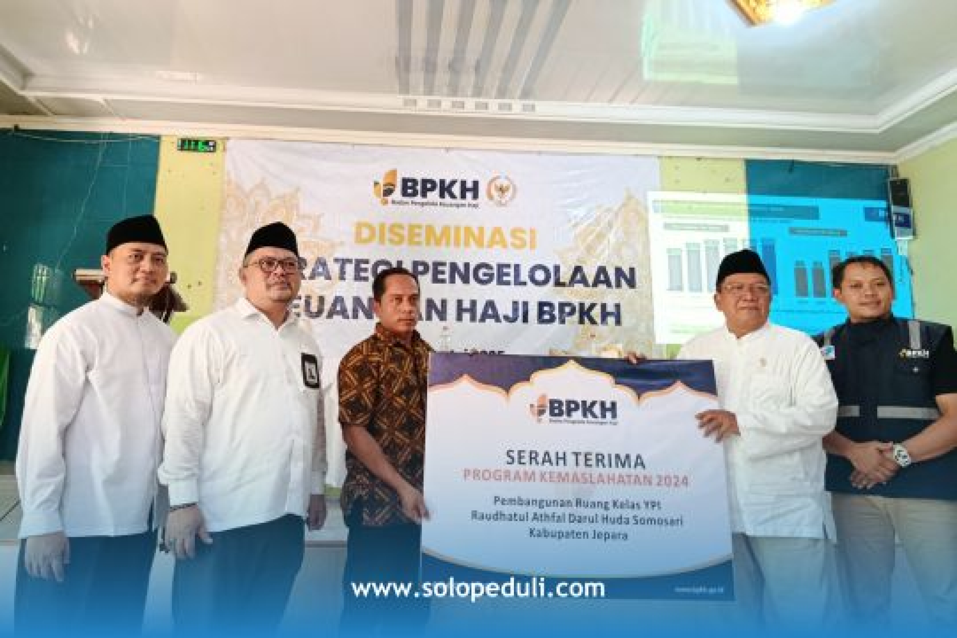 Badan Pengelola Keuangan Haji (BPKH) menggandeng SOLOPEDULI sebagai Mitra Kemaslahatan dalam merealisasikan Program Pembangunan Ruang Kelas YPI Raudhatul Athfal (RA) Darul Huda Somosari, Kabupaten Jepara. Serah terima program kemaslahatan tersebut dilaksanakan pada Jumat (16/5/2025) dan dirangkaikan dengan agenda Diseminasi Strategi Pengelolaan Keuangan BPKH di dilaksanakan di Gedung NU Desa Suwawal, RT 08 RW 03, Kecamatan Mlonggo, Kabupaten Jepara.