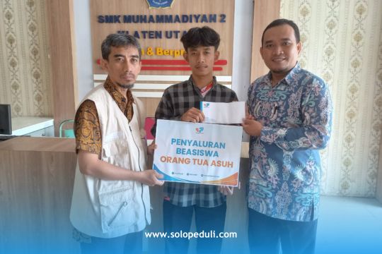 Penyaluran pertama dilakukan pada Kamis (15/01/2026) kepada Raditya Rahmadhani, siswa kelas XII jurusan Desain Komunikasi Visual (DKV) SMK Muhammadiyah 2 Klaten Utara. Beasiswa diserahkan oleh Amil SOLOPEDULI Cabang Klaten, Andi Jaya Ijaya, didampingi Angga, S.Kom., selaku Wakil Kepala Sekolah Bidang Kurikulum.