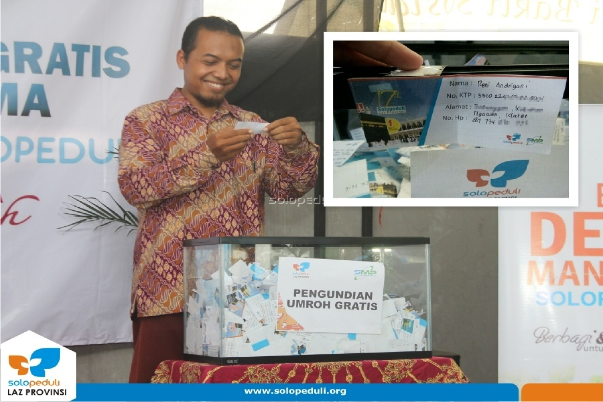 SOLO– Kamis (15/12) usai serah terima Ambulance Gratis oleh CIMB Niaga Syariah, Solopeduli menyelenggarakan pengundian program Umroh Gratis untuk donatur. Program ini merupakan rangkaian agenda Milad Solopeduli yang ke-17 tahun.